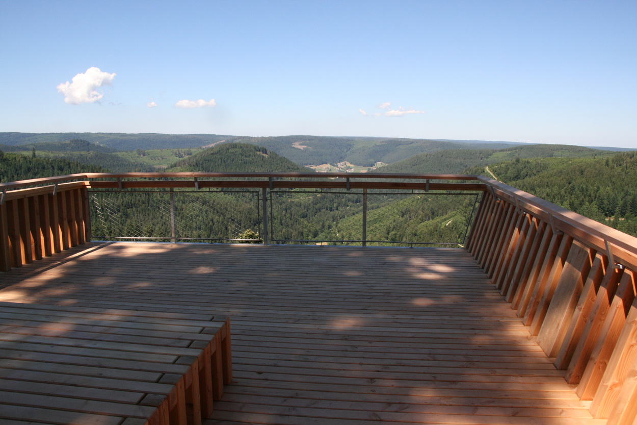 Genießen Sie den wunderschönen Panoramablick der Aussichtsplattform Ellbachseeblick. Die Plattform ist aus massiver Weißtanne, wurde 2013 fertiggestellt und ist barrierefrei zugänglich. Sie liegt circa 10 Meter über dem Waldboden und man hat eine schöne Aussicht über den Ellbachseee, nach Baiersbronn-Mitteltal und zur Hornisgrinde.