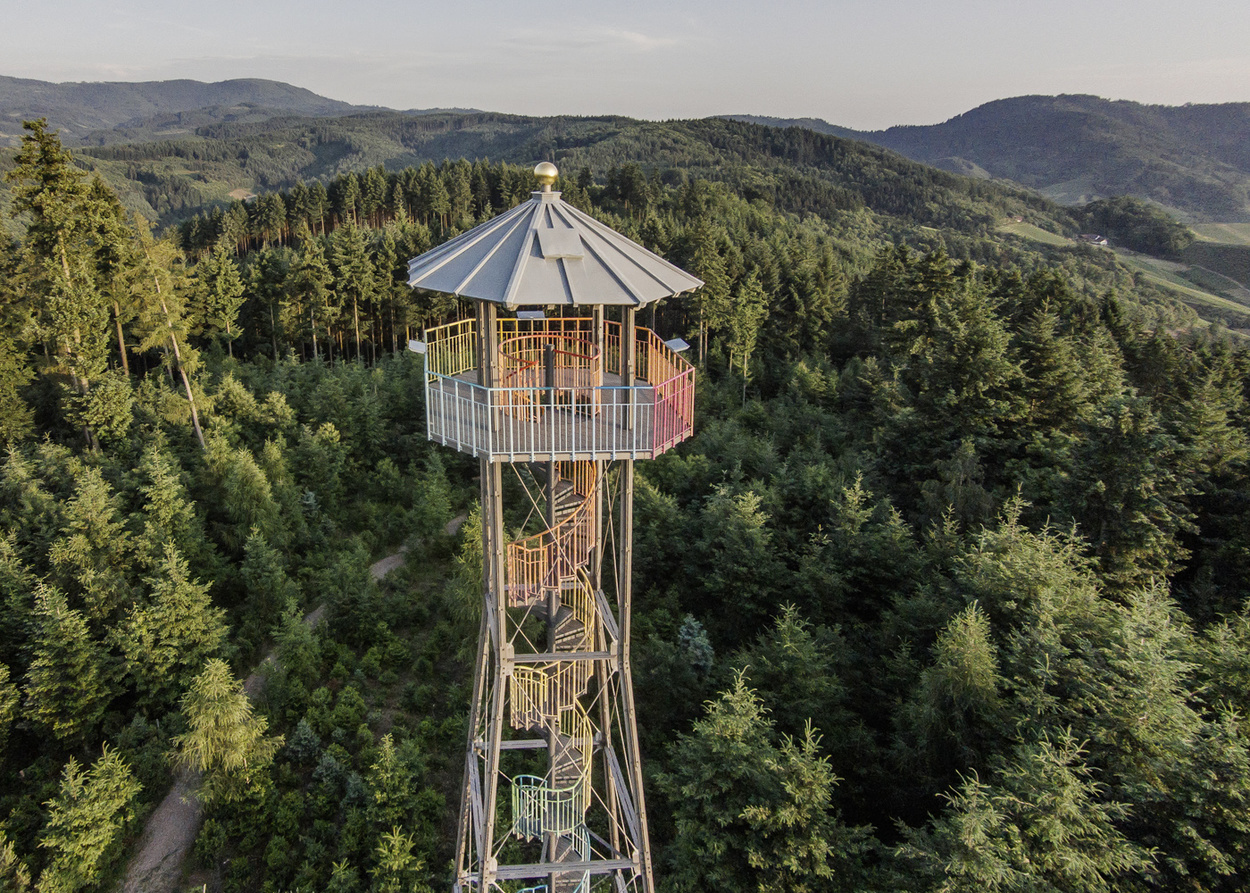 Der Aussichtsturm ist 20 Meter hoch und wurde im Jahr 2000 gebaut und eingeweiht. Der Geigerskopfturm ist aus Metall und wurde in Regenbogenfarben angemalt.