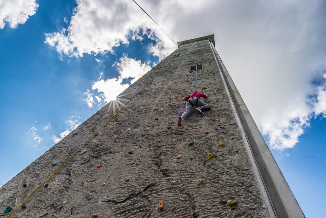 Für Hobbykletterer gibt es an der Turmwand eine 9 Meter hohe Übungskletterwand mit unterschiedlichen Einstiegsmöglichkeiten. Das Klettern ist allerdings nur unter einer Voranmeldung bei der TEAMWELT möglich.