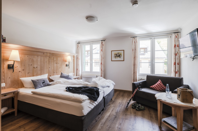 Das Hotel verfügt über 42 Betten in Einzel-, Doppel- und Dreibettzimmern, sowie Ein- und Zweiraum-Appartements, die alle mit Dusche/WC, TV und teilweise mit Balkon und Minibar ausgestattet sind.Doppelzimmer mit Nutzung des Wellness-Bereichs: