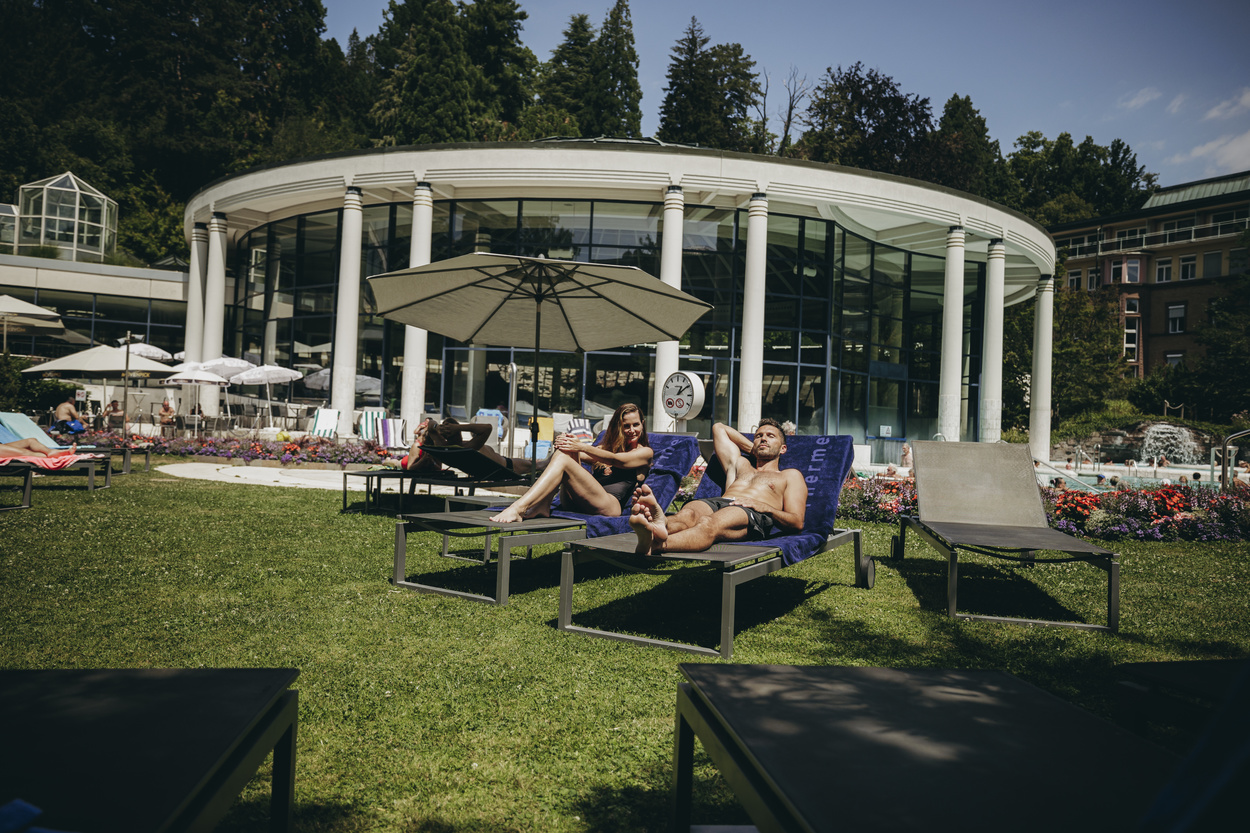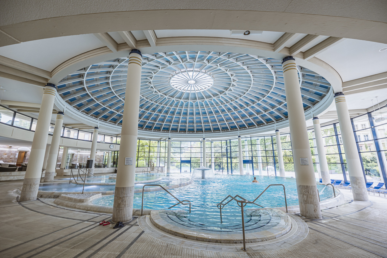 Die Caracalla Therme bietet mit ihrer eindrucksvollen Bade- und Saunalandschaft Wellness pur auf 5 000 qm. Römische Mosaike und Säulen geben der Anlage einen römischen Flair. Das gesunde Thermalwasser der Innen- und Außenbecken hat eine Temperatur von 30 - 34 °C. Genießen Sie eine Massage in der WellnessLounge und lassen Sie den Alltag hinter sich.