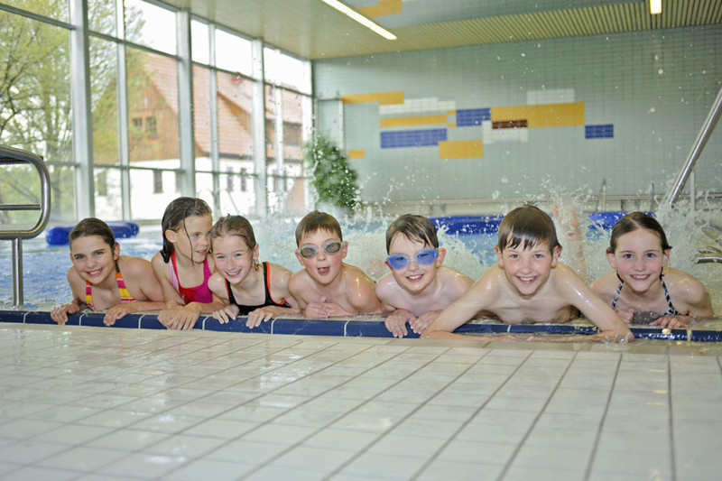 Hallenbad mit Spiegeldecke, die das Rückenschwimmen erleichtert, verstellbarer Wassertiefe, Kursangebot und jährlichem Kinderschwimmfest.