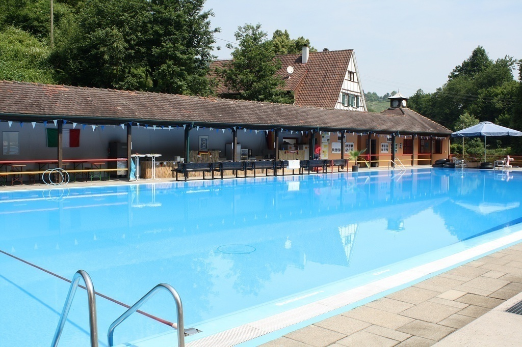 Freibad mit großer Liegewiese, 50-m-Becken und separatem Kleinkindbecken. Idyllische Schwimmbad-Lage: Umgeben von grünen Hügelwiesen.