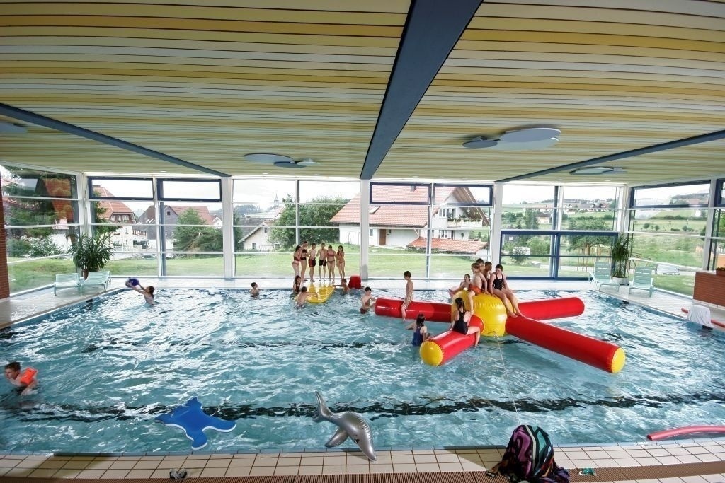 Hallenbad mit Hubboden, durchgehend 29° C, Sauna und Solarium.