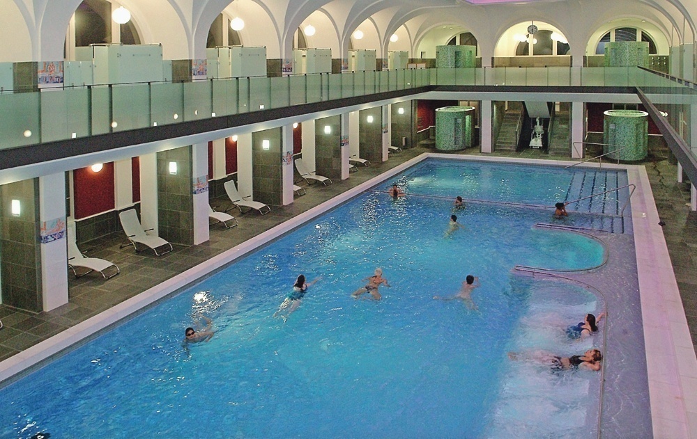 Historisches Hallenbad mit großer Saunalandschaft, Physiotherapie- und Massagepraxis und Wohlfühloase.