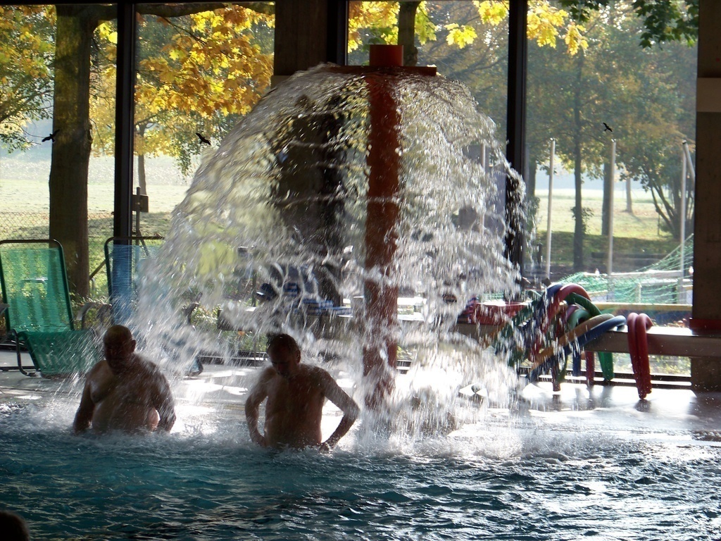Hallenbad mit Hubboden, Massagedüsen, Wasserpilz und Solarium.
