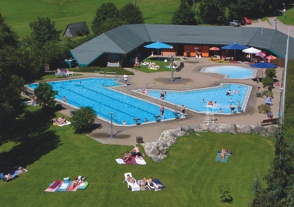 Schön angelegtes Freibad mit 3 Becken und großzügiger Liegewiese direkt am Bachlauf, einen Spielplatz, einen Sportplatz und einen Kiosk.