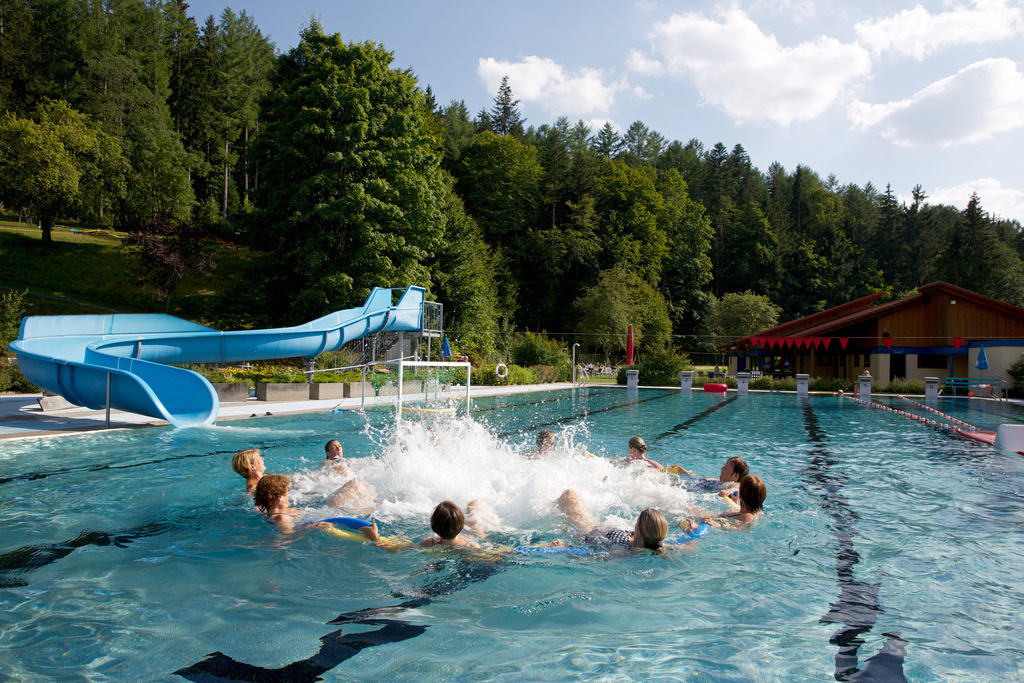 Freibad mit geschützem Kinderbereich, langer Rutsche und schöner Liegewiese.
