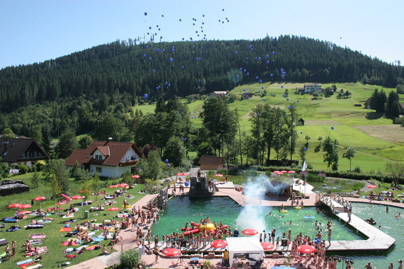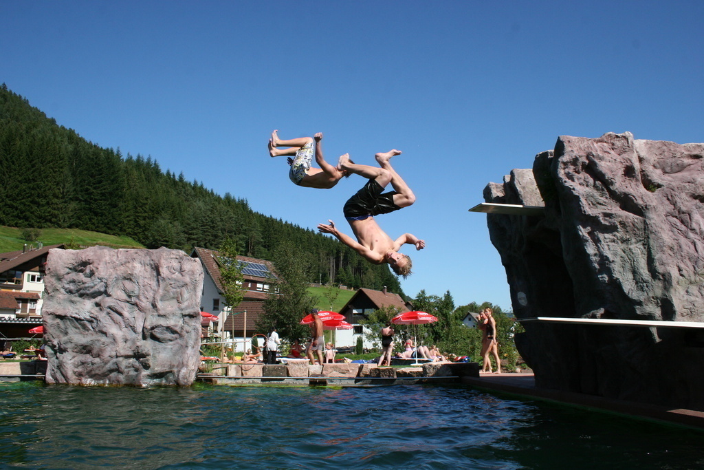 Großes Naturbad in schönster Lage mit biologischer Selbstreinigung, drei Schwimmbereichen, Kinder-Rutsche, Wasserspielsachen und Sprungfelsen.