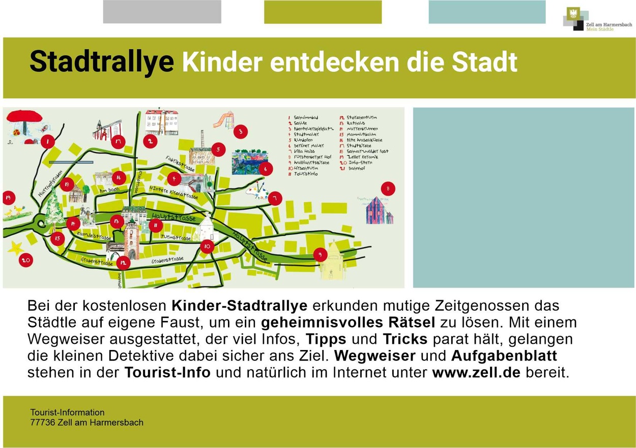 Bei der kostenlosen Kinder-Stadtrallye erkunden mutige Zeitgenossen das Städtle auf eigene Faust, um ein geheimnisvolles Rätsel zu lösen. Mit einem Wegweiser ausgestattet, der viele Infos, Tipps und Tricks parat hält, gelangen die kleinen Detektive dabei sicher ans Ziel. Der Wegweiser ist in der Tourist-Info kostenlos zum Ausleihen erhältlich. Aufgabenblatt und Wegweiser stehen natürlich auch im Internet unter www.zell.de zum Download parat.
