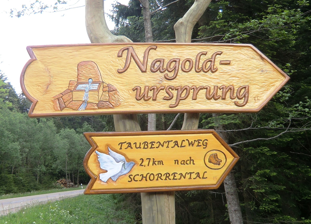 Über die Freudenstädter Straße laufen Sie einen kleinem Abstieg hinab zur Laurenzius Kirche und folgen dem ausgeschriebenen Mittelweg. Auf dem Weg erwartet Sie etwas weiter die Schwarzwaldmühle. Der gelben Raute folgend, erreichen Sie die obere Kante eines Kars. Der Karsee ist fast trocken, daher kann man einen schmalen Pfad abwärts ins Schorretal laufen und zum Einstieg ins wildromatischen Taubental. Hier empfiehlt sich eine Besichtigung des Nagoldursprungs, ein echter Kleinod und pure Naturidylle. Zurück kehren Sie über den Aufstieg zum Kirchweg, durch den Weiler Urnagold und über den Parkplatz Lerch.