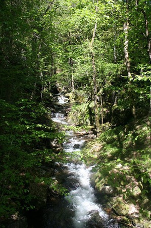 Durch lichten Buchenmischwald spazieren wir im Halbschatten bequem bergab. Dabei ergeben sich immer wieder hübsche Blicke ins noch junge Tal der Wiese. Am südlichen Ortsausgang von Fahl (5) kommen wir ein letztes Mal der recht lauten B 317 nahe. (In Fahl gibt es die Möglichkeit zur Einkehr im Gasthaus Lawine.)